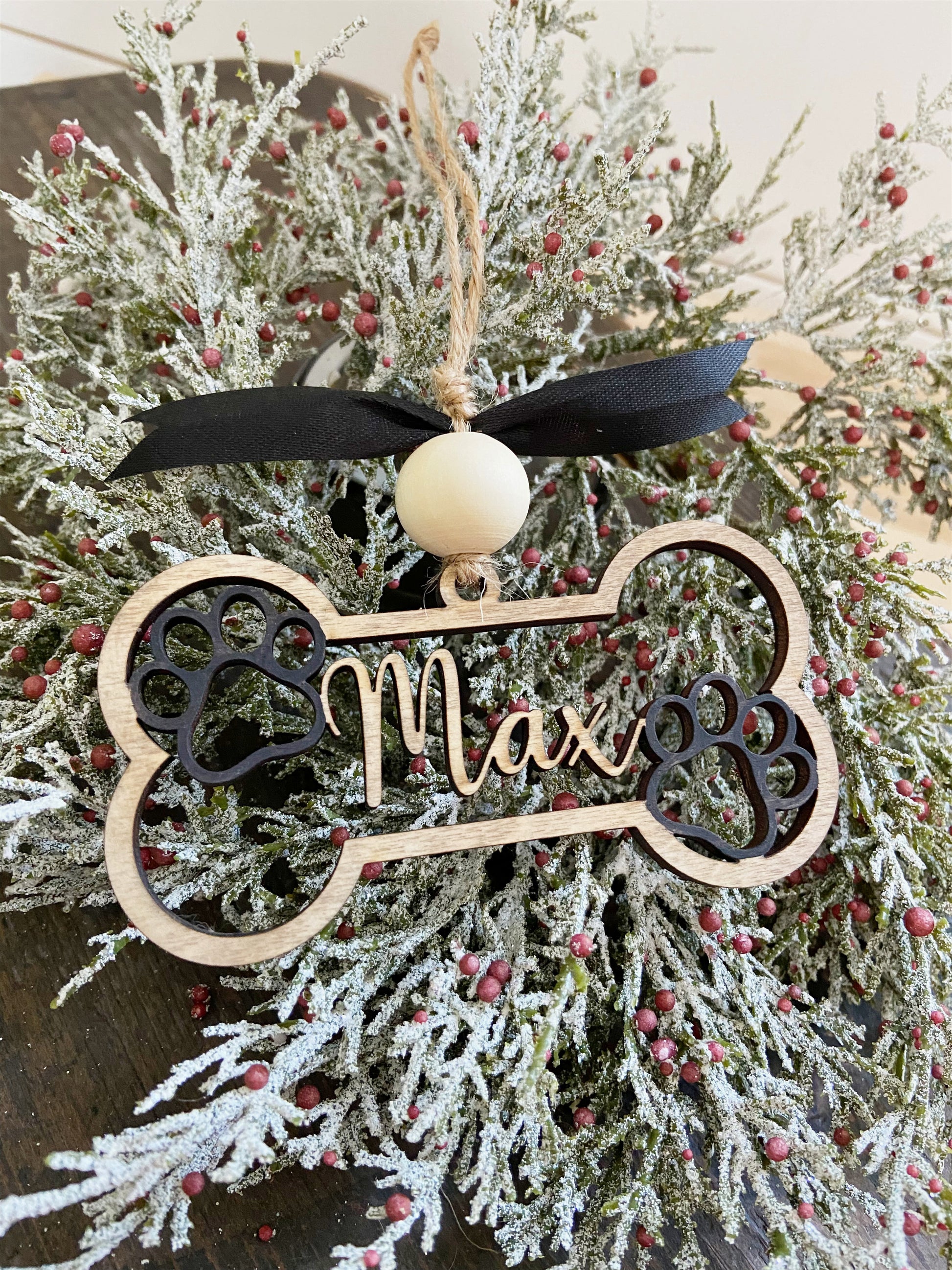 Celebrate your fur baby with this beautiful 3D cut bone ornament with your pups name cut into it. NOTE YOUR NAMES IN THE "NOTES" SECTION ON THE LAST PAGE OF CHECKOUT. The personalization box does not show on the order forms when printed.